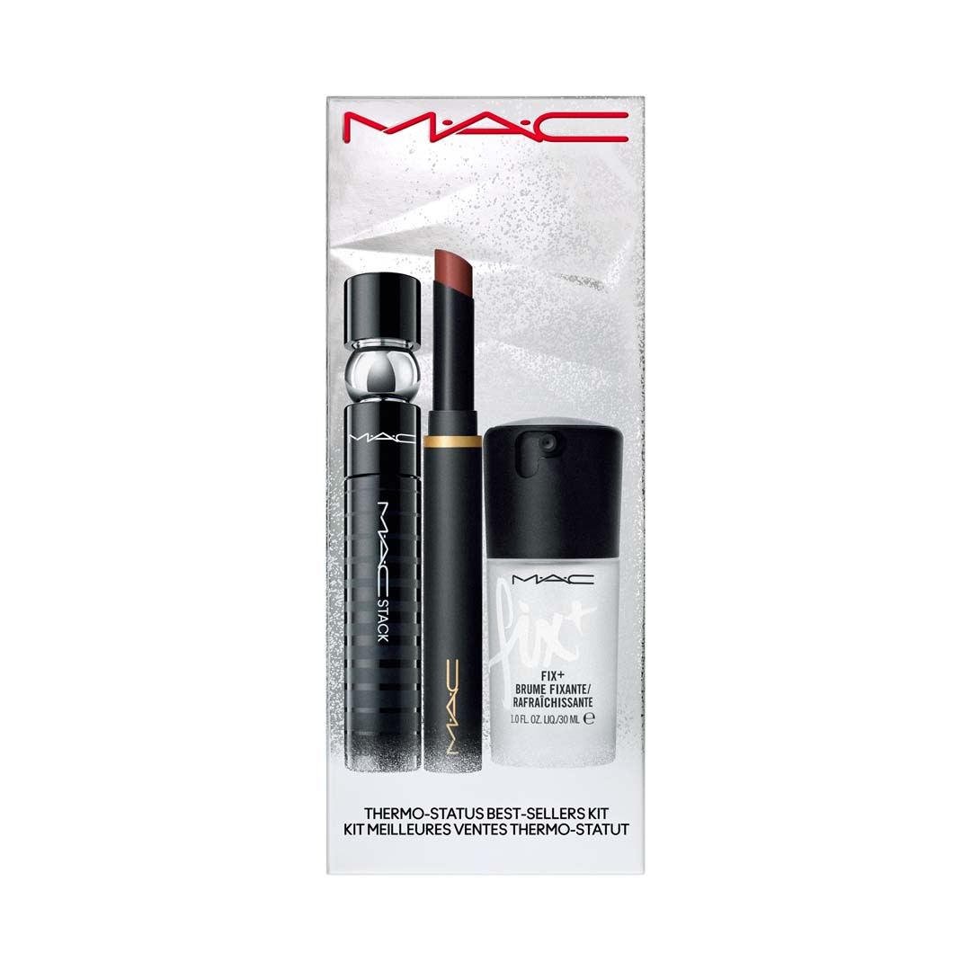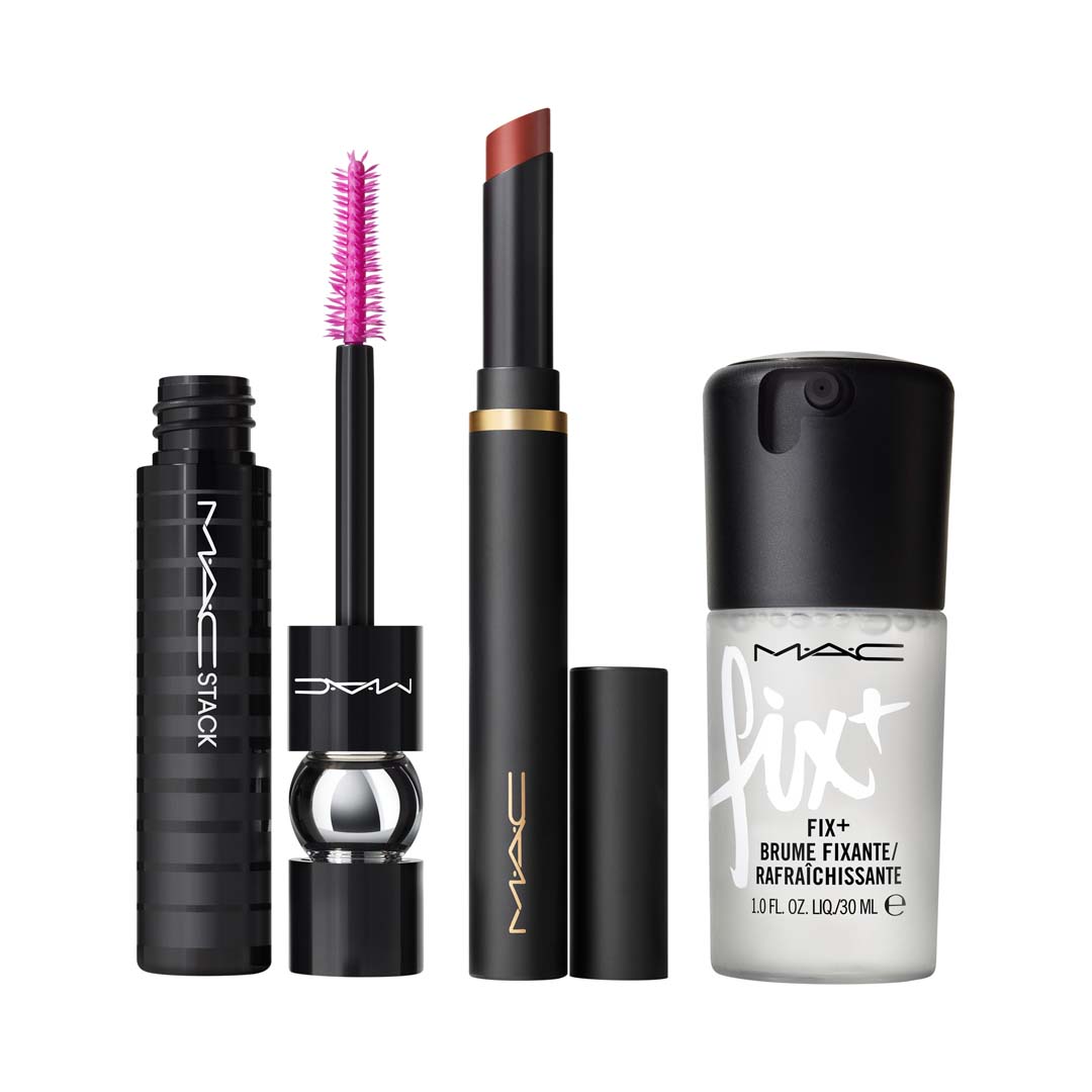 Luce radiante para la temporada navideña con este kit de tres productos más vendidos. Este conjunto de edición limitada de elementos esenciales seleccionados para ojos, labios y piel incluye Powder Kiss Velvet Blur Slim Stick de tamaño completo en Over The Taupe, máscara de pestañas M·A·C Stack y un mini Fix+. Powder Kiss Velvet Blur Slim Stick es un lápiz labial humectante que brinda 12 horas de color mega atrevido y uso ultraligero en una sola pasada suave como el terciopelo . M·A·C Stack Mascara es una máscara de pestañas infinitamente edificable y resistente a los grumos que se acumula en infinitas capas de volumen y longitud.Fix+ / Mini M·A·C es un spray fijador hidratante sin alcohol en un tamaño apto para viajes que refresca la piel y finaliza el maquillaje.